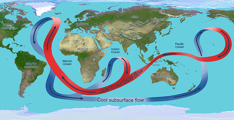La circulación meridiana se activa por un gradiente de densidad en el agua: cuando las aguas saladas y cálidas de latitudes bajas pierden temperatura, van ganando densidad y cuando llegan al Atlántico Norte descienden al fondo del mar.
