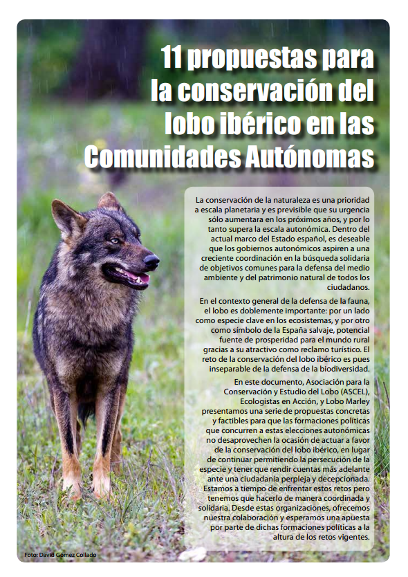 Las organizaciones Ecologistas en Acción, Lobo Marley y la Asociación para la Conservación y Estudio del Lobo Ibérico (ASCEL) han presentado un conjunto de once propuestas para la conservación del lobo ibérico en las comunidades autónomas, entre las que piden incluir al lobo en el catálogo de especies amenazadas regionales y paralizar los controles de población, entre otras.