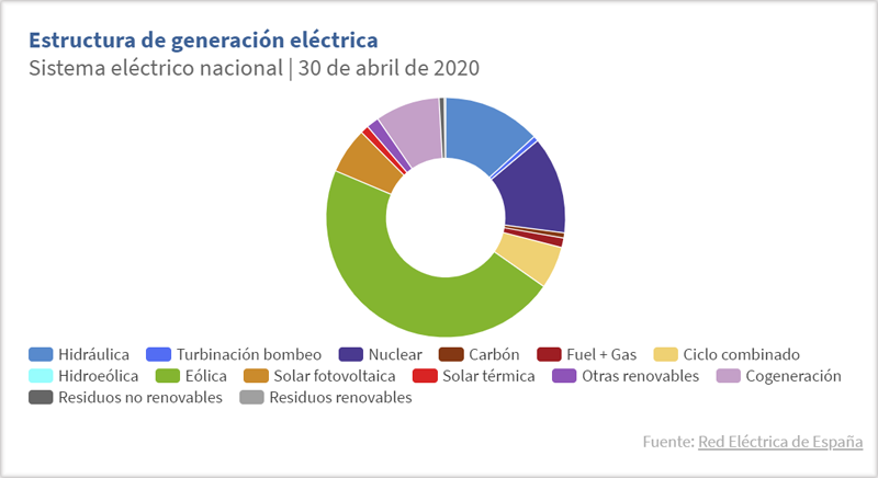 Este mes de abril, el viento permitió a la eólica ser responsable de la quinta parte del total mensual. También las lluvias incrementaron la producción hidráulica en un 48,5% respecto a abril de 2019, y los días soleados sirvieron a la fotovoltaica para registrar 1.143 GWh de generación nacional, nuevo máximo de generación en un mes.