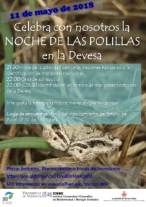 * Viernes 11: Jornadas noche de las polillas en Albufera de Valencia. (SEO Birdlife) En esta jornada os invitamos a conocer mejor un grupo faunístico de gran interés pero muy desconocido para el público en general, que podremos descubrir de cerca. Las plazas son limitadas, por lo que la pre-inscripción ha de realizarse a través del formulario:https://goo.gl/forms/V5QTmaB0rKd4Q3fJ2 ¡Os esperamos!