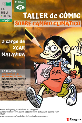 * Sábado 15: Taller de comic sobre cambio climático, CDAMAZ Zaragoza. En el marco de la exposición de viñetas El cambio climático no tiene gracia II , que puedes disfrutar todo el mes de febrero en la biblioteca verde, lanzamos este taller donde el humor y los trazos se conjugan para dibujar el cambio climático, tal y como lo pueden expresar los chavales y chavalas a los que retamos a inventar una historia.En el taller aprenderemos a realizar dibujos básicos, a darles expresividad, a usar las nociones básicas del cómic y acabaremos realizando una página con guión y dibujo propios.