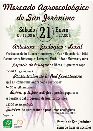* Sábado 21: Mercado Ecológico de San Jerónimo (Sevilla). De 11 a 17 h tendrá lugar un mercado ecológico, zona de trueque y presentación de la red ecoartesana. También habrá una barra para degustar tapas ecológicas. Parque de San Jerónimo, zona de huertos sociales.