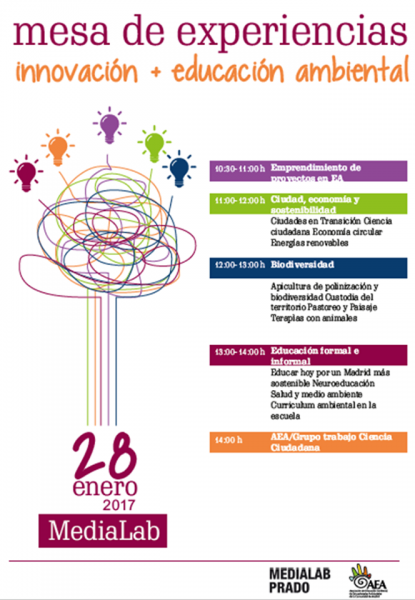 * Sábado 28: AEA Madrid (Asociación Madrileña de Educación Ambiental) celebrará una mesa de experiencias innovadoras de educación ambiental, que suponen además ejemplos interesantes de autoempleo para la transformación ecosocial. En la mesa participarán distintos ponentes que participan activamente en el desarrollo de estos proyectos. Será a partir de las 10:30 en Medialab Prado.