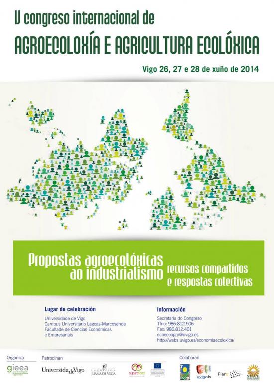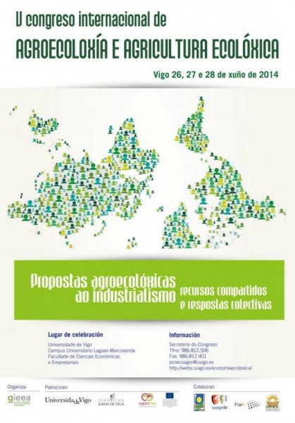 * Congreso de Agroecología y Agricultura Ecológica. El Grupo de Investigación en Economía Ecolóxica e Agroecoloxía de la Universidad de Vigo organiza el V Congreso Internacional de Agroecología y Agricultura Ecológica que se celebrará en Vigo los días 26, 27 y 28 de junio de 2014. El lema de esta edición es el de “Propuestas agroecológicas al industrialismo: recursos compartidos y respuestas colectivas”.