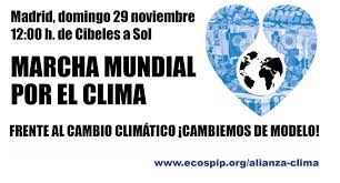 * Domingo 29: Marcha Mundial por el Clima. a un día del comienzo de la COP de París se ha convocado la Marcha Mundial por el Clima para poner de manifiesto la implicación de los ciudadanos en la lucha contra el cambio climático. Podemos apuntarnos a los distintos eventos que se celebran en los municipios que se han unido a esta iniciativa global. En Madrid a las 12h habrá una marcha de Cibeles a Sol.