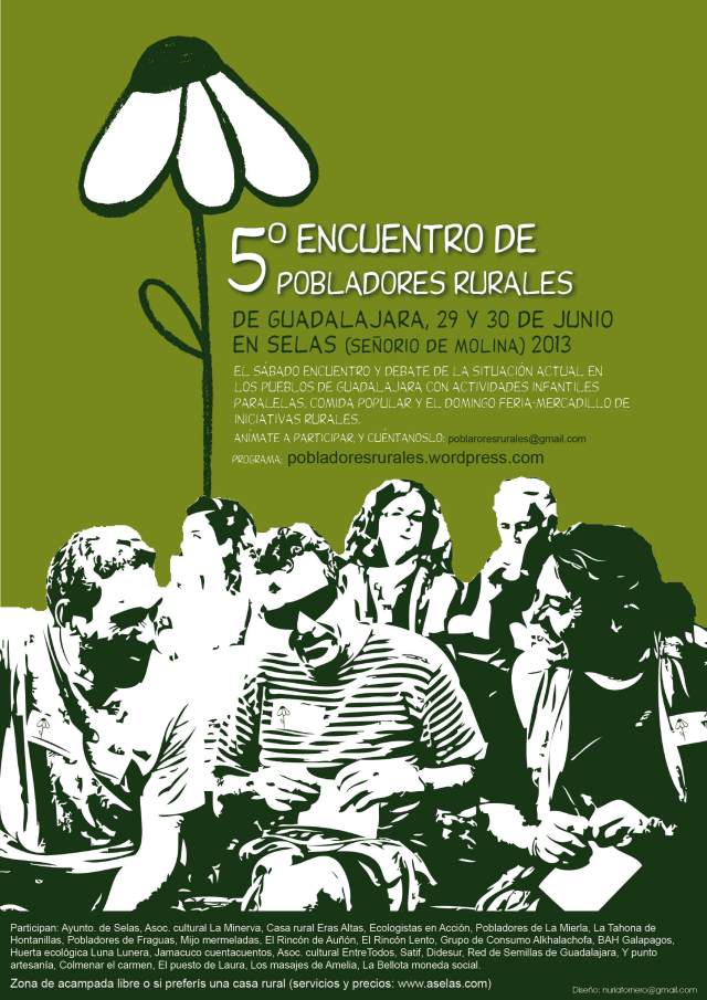 * Sábado 29 y Domingo 20: V Encuentro de Pobladores rurales de Guadalajara Un año más, y ya van cinco, nos concentramos para analizar la situación del mundo rural en el que vivimos o nos gustaría vivir, y para ello os convocamos a todos a participar en los debates, las iniciativas, los análisis y la puesta en común de la realidad. En Selas, Molina de Aragón. Habrá debate, mercadillo y actividades para los más pequeños.