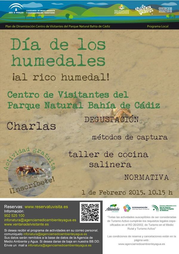 * Domingo 1: Día de los Humedales del Parque Natural Bahía de Cádiz. Podrás conocer la importancia que tienen los humedales como ecosistemas, la fauna asociada, la flora, el tipo de vida de sus gentes…. y toda el aprovechamiento gastronómico que nos ofrecen. Habrá una charla sobre el marisqueo y un taller de cocina salinera con degustación.