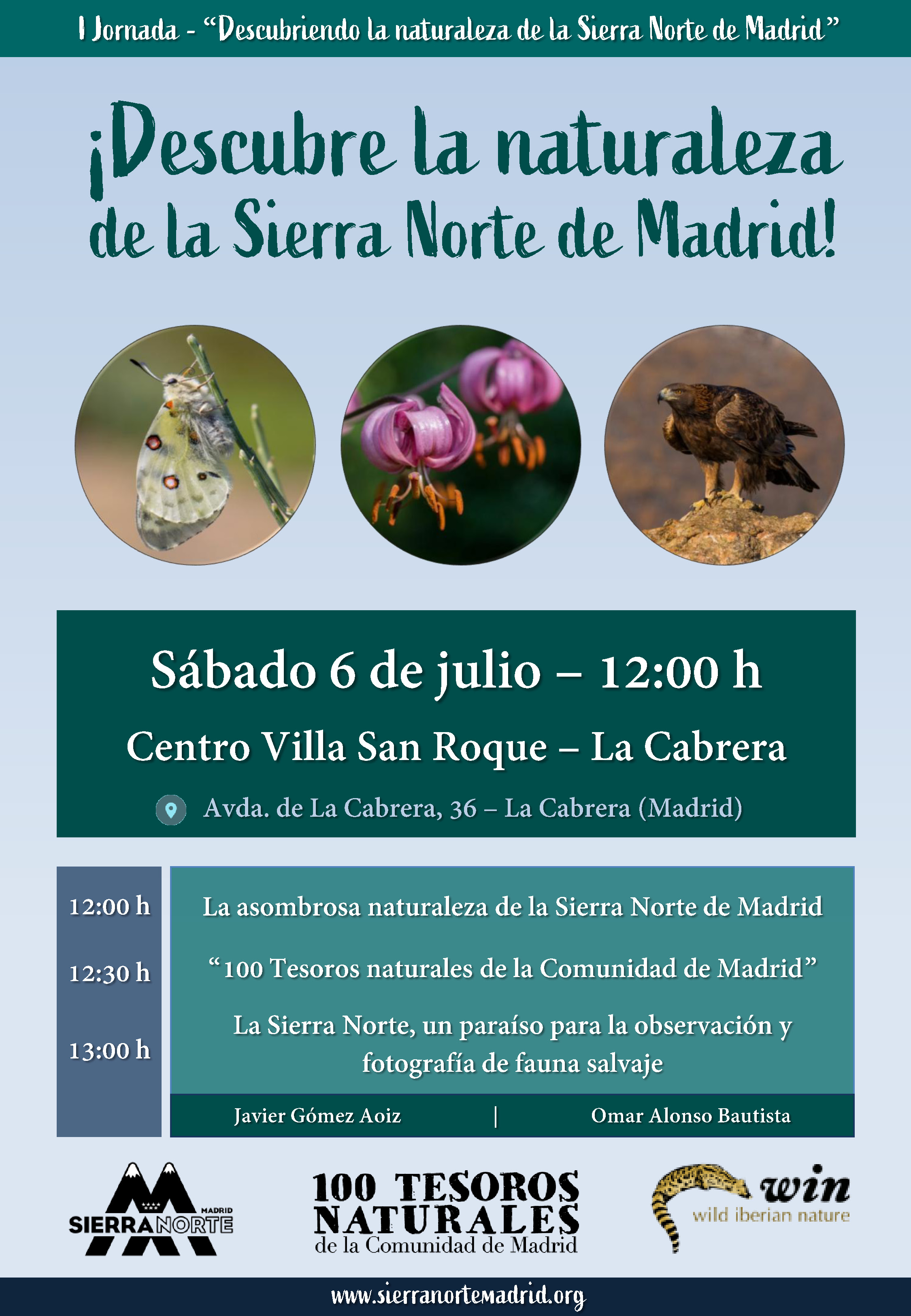 * Sábado 6: I Jornada Descubriendo la Naturaleza de Sierra Norte, Madrid. El sábado Aprovechando la presentación del libro «100 Tesoros Naturales de la Comunidad de Madrid» de Javier Gómez Aoiz, tendrá lugar una jornada con charlas en la que se conocerá la naturaleza de la Sierra Norte de Madrid. Será en el Centro villa de san roque de la Cabrera Madrid, desde las 12.