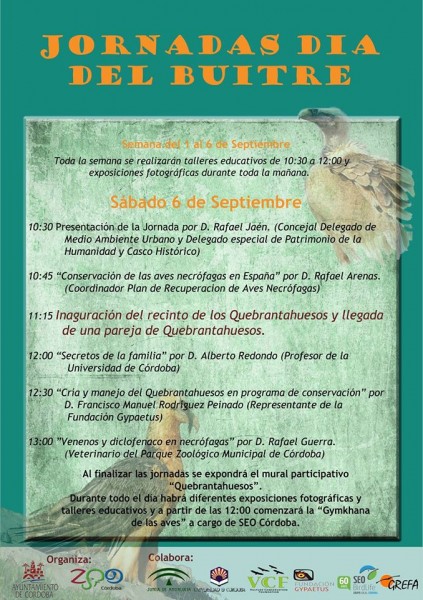 * Sábado 6: Jornadas por el día del Buitre en el zoo de Córdoba . Charlas divulgativas e inauguración del pabellón de quebrantahuesos.