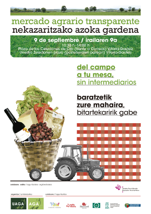 * Sábado 9: Mercado Agrario Transparente en Vitoria-Gasteiz El mercado busca fomentar el consumo de productos locales y acercar de primera mano a los vecinos y vecinas los alimentos que se producen en Álava. Constará de una veintena de puestos en los que las personas que se acercan podrán adquirir, directamente de las explotaciones alavesas, hortalizas, legumbres, embutidos, pollo, huevos, queso, miel, pan, vino, txakoli, mermeladas, etc. También habrá una degustación de pollo ecológico de Audikana gracias a la participación de Slow Food, cata y demostración de elaboración de mermeladas y para los más pequeños talleres infantiles. La organización señala que el objetivo es que el mercado sea un punto de encuentro entre el campo y la ciudad, donde las personas productoras alavesas ofrecen lo mejor que nuestra tierra proporciona, a un precio justo para el consumidor y digno para ellos. Además de garantizar la continuidad del sector, manteniendo la vida en los pueblos, favoreciendo la economía local y el desarrollo sostenible.