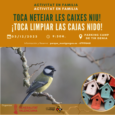 *Sábado 2: Toca limpiar cajas nido. Montgó, Castellón. Como cada año en otoño es tiempo de preparar las cajas nido del Montgó para que nuestros amigos los pájaros puedan criar con éxito a sus polluelos la próxima primavera. Si deseáis pasar una agradable mañana en familia conociendo las aves insectívoras del bosque y ayudando a mejorar los ecosistemas de la montaña, apuntaros a esta actividad.