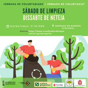 *Sábado 2: Sábado de limpieza: Desde el Parque Natural del Turia queremos colaborar con la Coordinadora de los Bosques del Turia, para celebrar el Día Mundial de la Naturaleza. Este sábado nos invitan a participar en una jornada de voluntariado donde podremos conocer diversas casuísticas sobre el estado de conservación del espacio natural protegido, conoceremos la biodiversidad de la ribera del Turia y su problemática, y realizaremos una actividad de recogida y clasificación de estiércol.