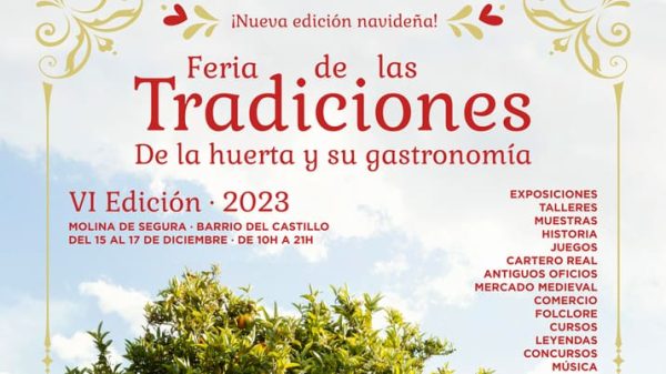 *VI Feria de las Tradiciones (Molina de Segura): Del 15 al 17 de diciembre de 2023 se organiza la VI Feria de las Tradiciones de Molina de Segura 2023, dedicada al sector de la huerta y su gastronomía, de 10.00 a 21.00 horas, en el Barrio del Castillo, como reconocimiento público a los usos y costumbres del municipio.