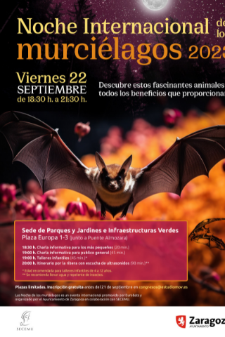 *Noche Internacional de los Murciélagos 2023 (Zaragoza): La Noche de los murciélagos es un evento internacional promovido por Eurobats y organizado por el Ayuntamiento de Zaragoza en colaboración con SECEMU donde descubriremos estos fascinantes animales y todos los beneficios que proporcionan.