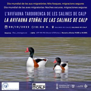 *La Avifauna Otoñal de las Salinas de Calpe: Con motivo del Día Mundial de las Aves Migratorias, el día 8 de octubre, el Parque Natural del Peñón de Ifach, en colaboración con el Ayuntamiento de Calp, organiza una jornada de observaciones para descubrir las aves que visitan las salinas durante el otoño.