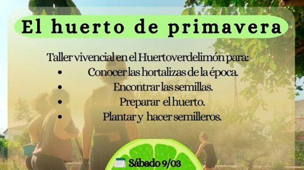 *Sábado 9. Taller infantil: El Huerto en Primavera. Huerto Verde Limón, Puente Tocinos (Murcia). Los niños y niñas que asistan podrán aprender a través del juego y la experiencia cómo empezar un huerto desde cero. ¿Dónde encontrar las semillas en las verduras? ¿Cómo preparar la tierra y organizar la plantación? Conocer las hortalizas de la época Plantar y hacer semilleros