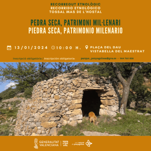 *Sábado 13: Piedra seca, patrimonio milenario. Recorrido etnológico por el Tossal del Mas del Hostal. La arquitectura popular de la piedra seca ha moldeado el paisaje de sus tierras de interior y de buena parte del mediterráneo a lo largo de milenios. Con los escasos medios de que disponían sus constructores/as y con todo el tiempo del mundo, era inevitable que esta laboriosa y eficaz técnica constructiva se generalizara en nuestro territorio. Masías y corrales, casas-refugio, norias, aljibes, fuentes, muros de contención de bancales, límites de vías pecuarias senderos y de parcelas de pastos o cultivos fueron construidos total o parcialmente de esta manera, permitiendo una forma de una vida y uso de la tierra adaptada al media durante incontables generaciones.