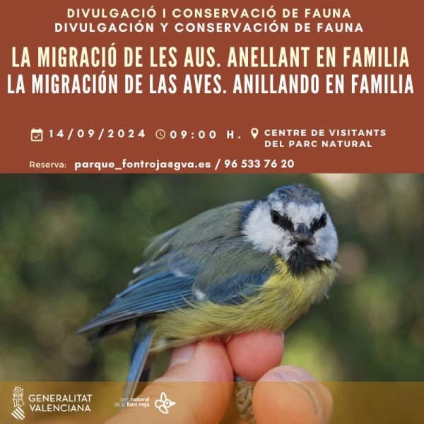 *Sábado 14: La migración de las aves. Anillando en familia, Parque Natural del Carrascal de la Font Roja: Sesión de anillamiento científico de aves donde podremos ver de primera mano las principales especies forestales que habitan en el Parque Natural del Carrascal de la Font Roja, y al mismo tiempo, de las que se puedan encontrar en ejes días y que hacen del Parque Natural una parada durante su migración. Asimismo, se podrá conocer los objetivos y la metodología de esta técnica de estudio.