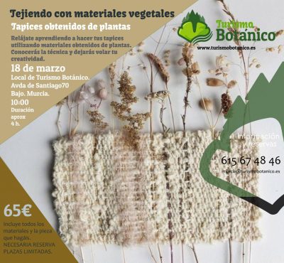 *Sábado 18: Taller tejiendo con materiales vegetales (Murcia): Relájate aprendiendo a hacer tus tapices utilizando materiales obtenidos de plantas. Conocerás la técnica y dejarás volar tu creatividad.