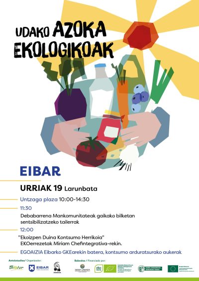 *Feria de Consumo Responsable y Ecológico (Éibar): El 19 de octubre se realizará en la plaza Unzaga la segunda edición de la feria de consumo responsable y ecológico. La feria, que se celebrará entre las 10:00 y las 14:30, ofrecerá a las personas visitantes la posibilidad de disfrutar de una amplia gama de productos ecológicos de temporada y locales, gracias a la participación de más de 15 productores/as.