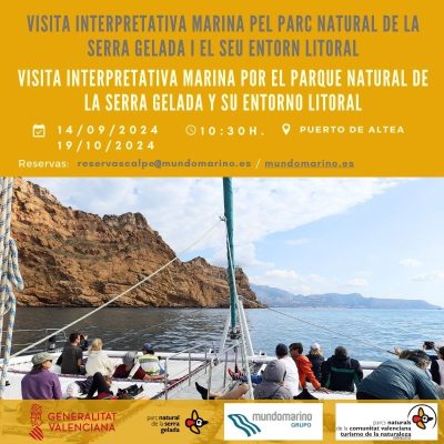 *Sábado 19: Visita interpretativa marina por el Parque Natural de la Serra Gelada y su entorno litoral: Visita guiada catamarán para explorar el Parque Natural de la Serra Gelada y su entorno litoral en colaboración con la empresa Mundo Marino S.A, será una visita interpretativa marina por parte de la bahía de Altea y  los impresionantes acantilados de Serra Gelada.