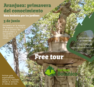 *Sábado 3: Free tour Aranjuez, primavera del conocimiento: Una ruta guiada para conocer la historia de un Paisaje Patrimonio de la Humanidad mas allá del perímetro de sus famosos jardines. El periplo de muchas especies vegetales que llegaron a la Península a través de estos emblemáticos vergeles, en uno de los momentos álgidos de la naturaleza ribereña, la primavera.