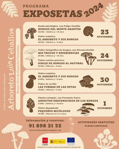*Sábado 30: Taller Setas de Arcilla, CEA Arboreto Luis Ceballos (Madrid): Durante esta actividad daremos un paseo por el arboreto para observar las setas que aparecen en época otoñal y conocer sus principales características. Con esta información aprenderemos a dibujar distintas especies de hongos de la manera más realista y útil posible.
