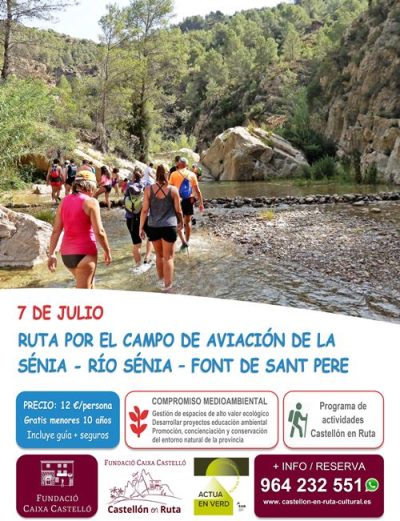 *Domingo 7. Ruta por el Campo de aviación de la Sénia (Tarragona) – río Sénia – Font de Sant Pere (Castellón). Después de visitar el aeródromo, nos dirigiremos al rio Sénia para realizar una excursión por su ribera hasta la Font de Sant Pere (la Pobla de Benifassà, Baix Maestrat), una de nuestras joyas naturales.Durante el recorrido junto al río, encontraremos varios lugares para el baño. Pasaremos por las pozas conocidas como “toll de l´Arenal”, “El Partidor” y “El Martinete”.