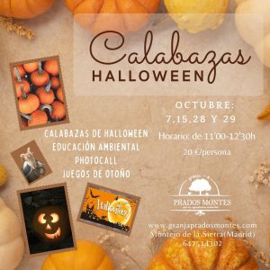 *Sábado 7: Taller de calabazas de Halloween. Granja Prados Montes, Montejo de la Sierra (Madrid). La Granja Prados Montes propone una actividad en familia durante el mes de octubre que consiste en cosechar las calabazas, para posteriormente decorarlas o vaciarlas. Habrá un photocall con temática de Halloween para hacerse las fotos de recuerdo con las calabazas. Además, se tratará el tema de la biodiversidad de la granja y la importancia ambiental de bichos de Halloween como murciélagos, arañas o serpientes. Por último, se prepararán juegos con temática otoñal de acercamiento a la naturaleza mediante lo lúdico que estarán adaptados a las distintas edades de los participantes.