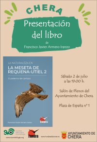 * Sábado 2: Presentación del libro: Cuaderno de Campo. La Naturaleza en la Meseta de Requena-Utiel 2. Esta obra, de Francisco Javier Armero Iranzo, es una invitación al descubrimiento, conocimiento y cuidado del patrimonio natural de la Meseta de Requena-Utiel. Presenta una selección de cuarenta y siete ensayos agrupados según el paso de las estaciones del año. En ellos se abordan los principales espacios naturales de esta extensa comarca, como las Sierras del Tejo, Negrete, de Juan Navarro o de Malacara; el Valle del Cabriel; o los Llanos cerealistas de Camporrobles y Sinarcas, entre otros; así como aquellas especies de animales y plantas más significativas (la nutria, la cabra montés, el águila real o el tejo, entre otras muchas).