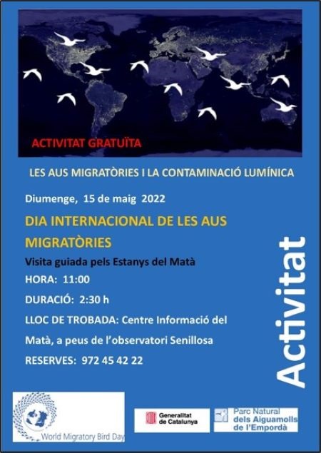 * Domingo 15: Las aves migratorias y la contaminación lumínica. Girona. Visita guiada por los humedales del Matá. Día Internacional de las aves migratorias.