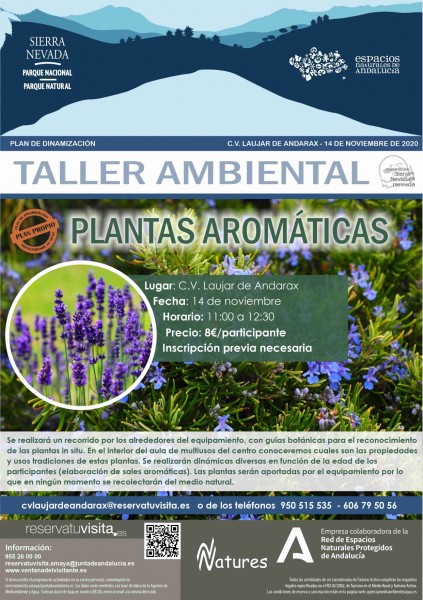* Sábado 14: Taller de Plantas Aromáticas. Centro de visitantes Laujar de Andarax, Almería. En el interior del aula de multiusos del centro conoceremos cuales son las propiedades y usos tradiciones de estas plantas. Se realizarán dinámicas diversas en función de la edad de los participantes (elaboración de sales aromáticas).