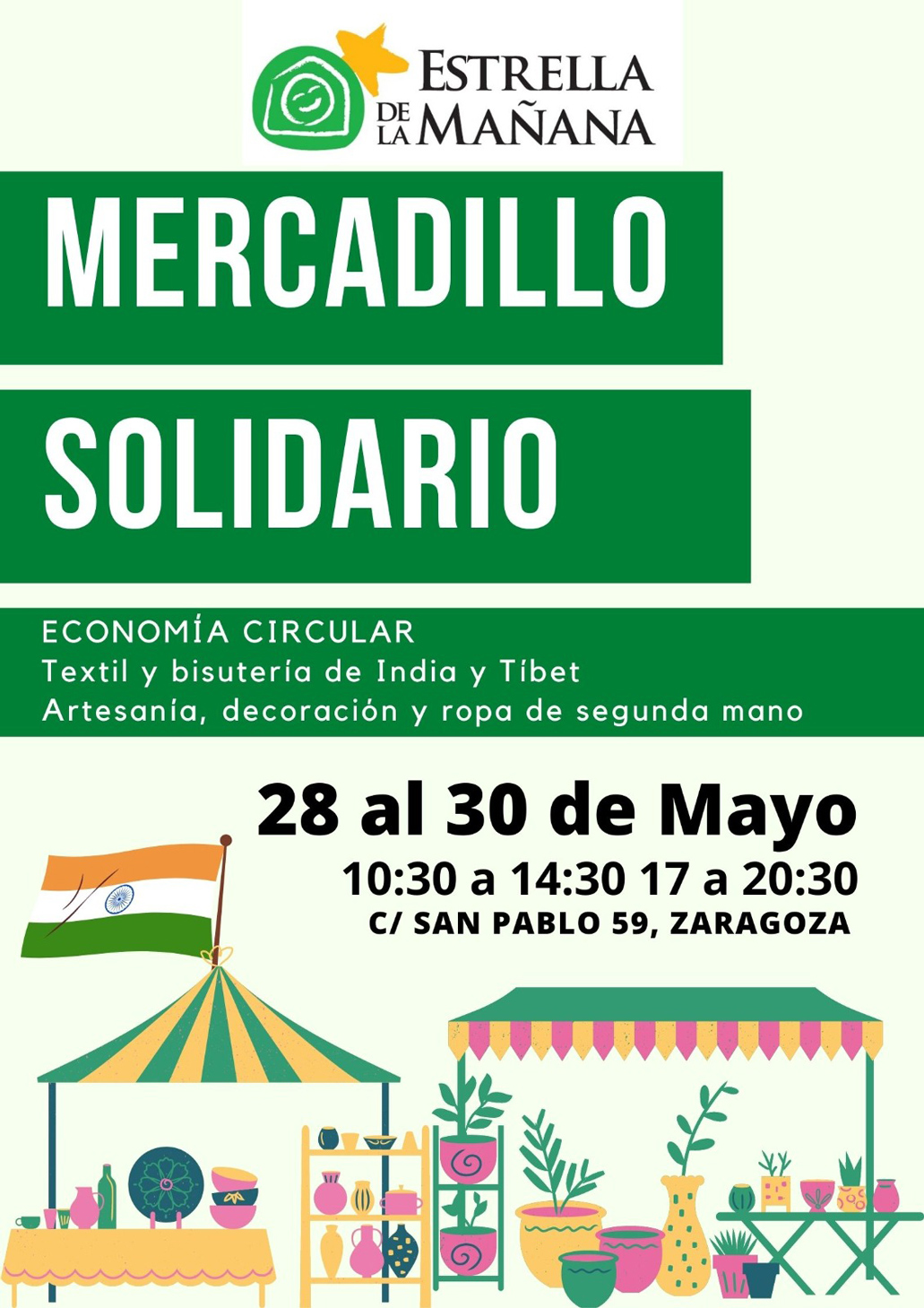 Mercadillo solidario Estrella de la Mañana. Zaragoza. Muestra de textiles y artesanía de India, Tíbet y Nepal, bisutería y joyería oriental, moda y complementos, con un fuerte impulso a la económica circular: decoración, juguetes, libros y promoviendo dar una segunda oportunidad a ropa de segunda mano.