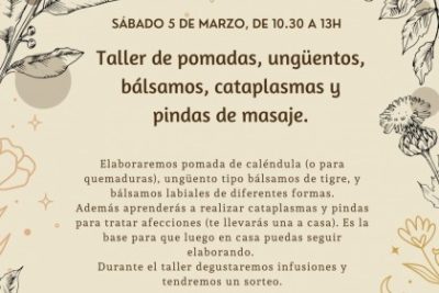 * Sábado 5: Taller de pomadas, Bálsamos, Ungüentos, pindas y cataplasmas. Cantabria. Elaboraremos pomada de caléndula (o para quemaduras), ungüento tipo bálsamos de tigre, y bálsamos labiales de diferentes formas.