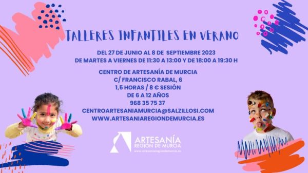 *Talleres infantiles de verano en el Centro Regional de artesanía de Murcia: Del 27 de junio hasta el 7 de septiembre de 2023, coincidiendo con las vacaciones estivales, la Dirección General de Consumo y Artesanía, lanza una nueva oferta de seis talleres infantiles para que los pequeños de la casa puedan disfrutar creando su propio producto artesano, y de este modo desarrollar su creatividad en sus vacaciones.