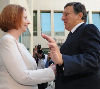Durao Barroso saluda a J. Gillard en su visita a Australia. Foto: AFP