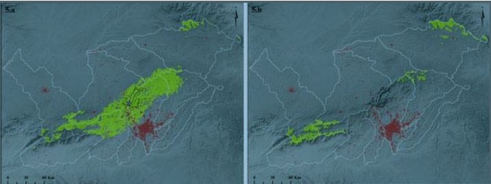 En estas dos imágenes puede apreciarse el cambio en la representatividad ambiental (en verde) del Parque Nacional de Guadarrama, así como las zonas antrópicas (en rojo), que pueden actuar como barreras de la conectividad espacial. La imagen de la izquierda representa el presente, la de la derecha un escenario futuro. Aquellos lugares que aparecen en verde en los dos escenarios son lugares que van a desempeñar un papel muy importante para el parque nacional, siendo necesaria la creación de conexiones entre estas zonas y la reserva en cuestión.