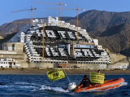 «0jalá el año que viene tengamos puesta una fecha de demolición«, dijo la consejera, aludiendo a unos «flecos judiciales» en realidad de gruesa envergadura. La licencia de obras «no ha sido anulada» -está declarada legal por sentencia del Tribunal Superior de Justicia de Andalucía-; «sigue en vigor» la «modificación» que se hizo de la planimetría del Parque Natural de Cabo de Gata «sin expediente alguno», denuncia Greenpeace; y la Junta de Andalucía «no ha accedido a los terrenos».
