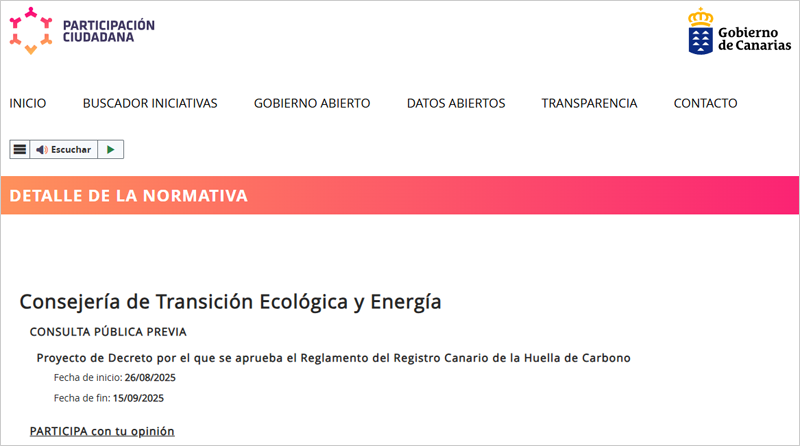 Hasta el 15 de septiembre está abierta la consulta pública previa del proyecto de Decreto por el que se aprueba el Reglamento del Registro Canario de la Huella de Carbono. Fuente: construible.es