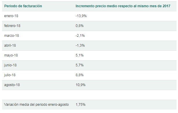 En la siguiente tabla se recogen las variaciones de precio de facturación con respecto al año anterior, y la variación media entre los meses de enero y agosto de este año (1,75%).