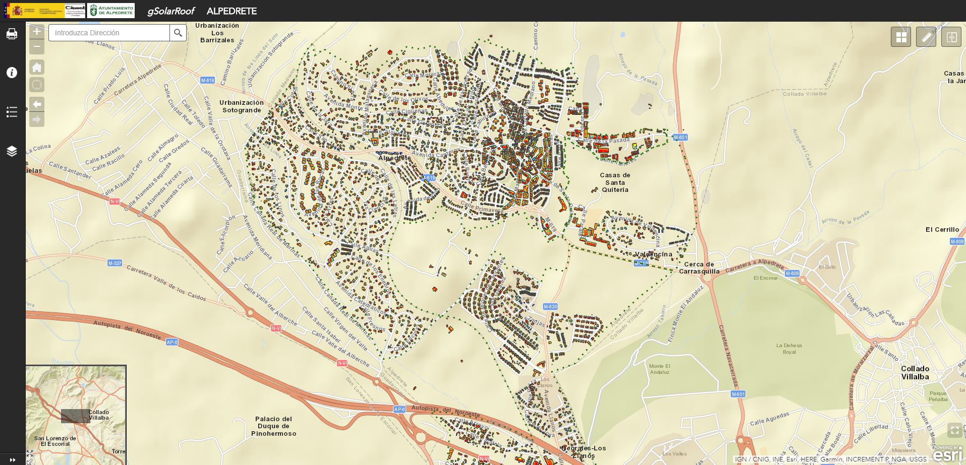 El mapa solar se encuentra en una de las pestañas superiores de la página web. Pinchando sobre ella se accede a la cartografía del municipio de Alpedrete. Escribiendo la dirección del inmueble el navegador irá directamente a la casa y se podrá consultar un desplegable en el que se detallan el número de metros cuadrados disponibles óptimos para cada tecnología, la potencia que se podría instalar y la energía que se generaría.