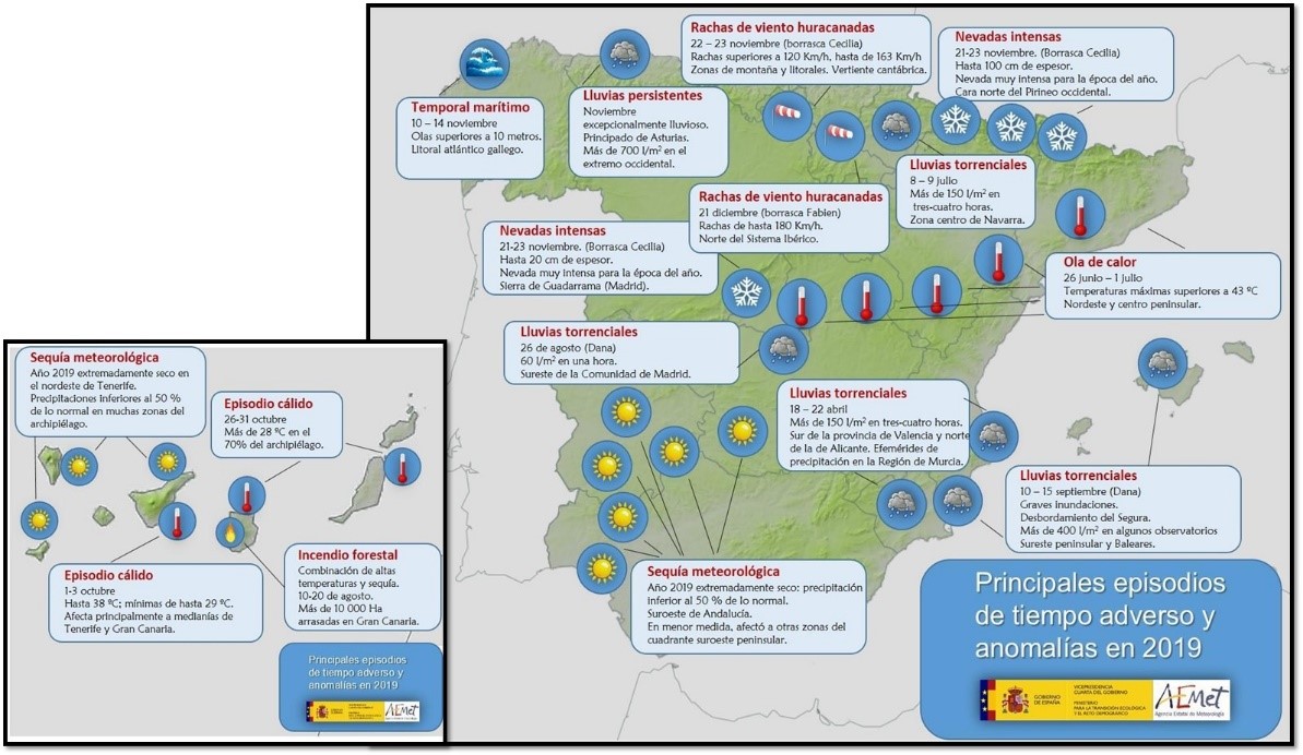 En relación a fenómenos meteorológicos adversos ocurridos, el informe los cuantifica a partir de los avisos emitidos por la Agencia Estatal de Meteorología: han sido más de 17.000, un 14% menos que en el año 2018, y de éstos, 199 han sido de nivel rojo (el 1.2% del total), un nivel que se emplea para avisar cuando la excepcional intensidad del fenómeno previsto u observado supone un riesgo extremo para la población.