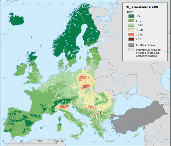 El informe de AEMA indica que seis Estados miembros superaron el valor límite de la Unión Europea para las partículas finas (PM2,5) en 2018: Bulgaria, Croacia, República Checa, Italia, Polonia y Rumanía. Solo cuatro países de Europa (Estonia, Finlandia, Irlanda e Islandia) registraron concentraciones de partículas finas por debajo de los valores guía más estrictos de la Organización Mundial de la Salud (OMS).