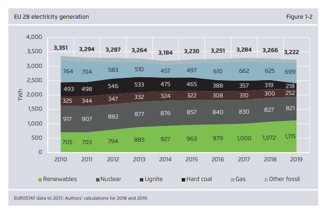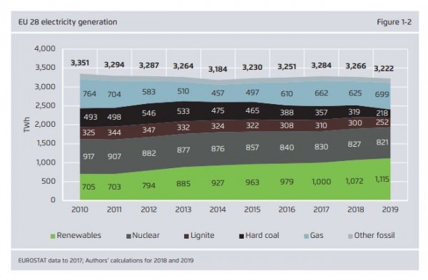 Tras la caída del uso del carbón en la UE el informe destaca dos factores: el aumento del precio de la tonelada de CO2 en el mercado europeo de emisiones (que hace que las centrales de carbón no sean rentables y se vean desplazadas por otras tecnologías menos emisoras) y la implantación de renovables. La electricidad que dejaron de producir las térmicas de carbón en 2019 en la UE fue generada casi al 50% por las tecnologías solar y eólica por un lado y por las centrales de gas natural por otro. Las centrales que usan gas también emplean un combustible fósil, pero emiten cerca de la mitad de CO2 para producir la misma electricidad que las de carbón.