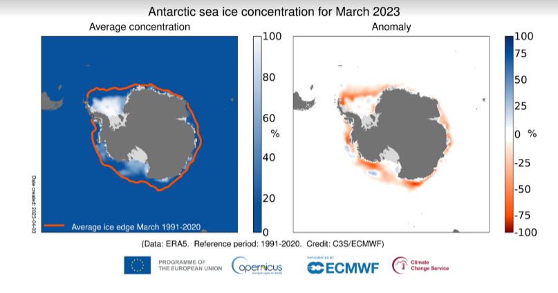 Las concentraciones de hielo marino fueron muy inferiores a la media en todos los sectores del océano Austral, según un comunicado de C3S, que ha apuntado que el pasado mes de marzo se registró como el segundo marzo más cálido a escala mundial desde que existen registros.