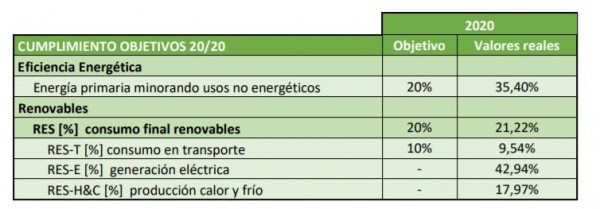 España ha cumplido los objetivos europeos de penetración de energías renovables y eficiencia energética fijados para 2020. Concretamente, el país debía cubrir un 20% de la demanda de energía final con renovables y lo ha superado holgadamente, hasta alcanzar el 21,2%, tanto por el incremento de la producción de la energía limpia como por la reducción de la demanda provocada por la crisis sanitaria. En el caso de la eficiencia energética también se ha superado con creces el objetivo comunitario del 20%, consiguiendo un 35,4%. En la siguiente tabla se resumen los valores sectoriales de energías renovables y eficiencia energética alcanzados en 2020, junto a los objetivos europeos comprometidos en cada caso: