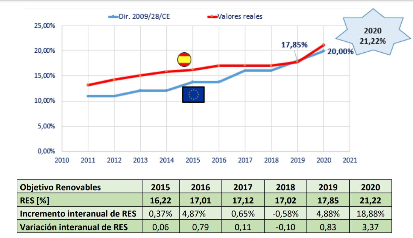 Para el año 2020, el porcentaje de energía procedente de fuentes renovables en el consumo final bruto de energía es del 21,22%, superando el objetivo del 20% establecido para España en la Directiva de Renovables. En la gráfica siguiente se puede apreciar cómo durante la década pasada el país ha superado la senda de penetración prevista por la normativa comunitaria.