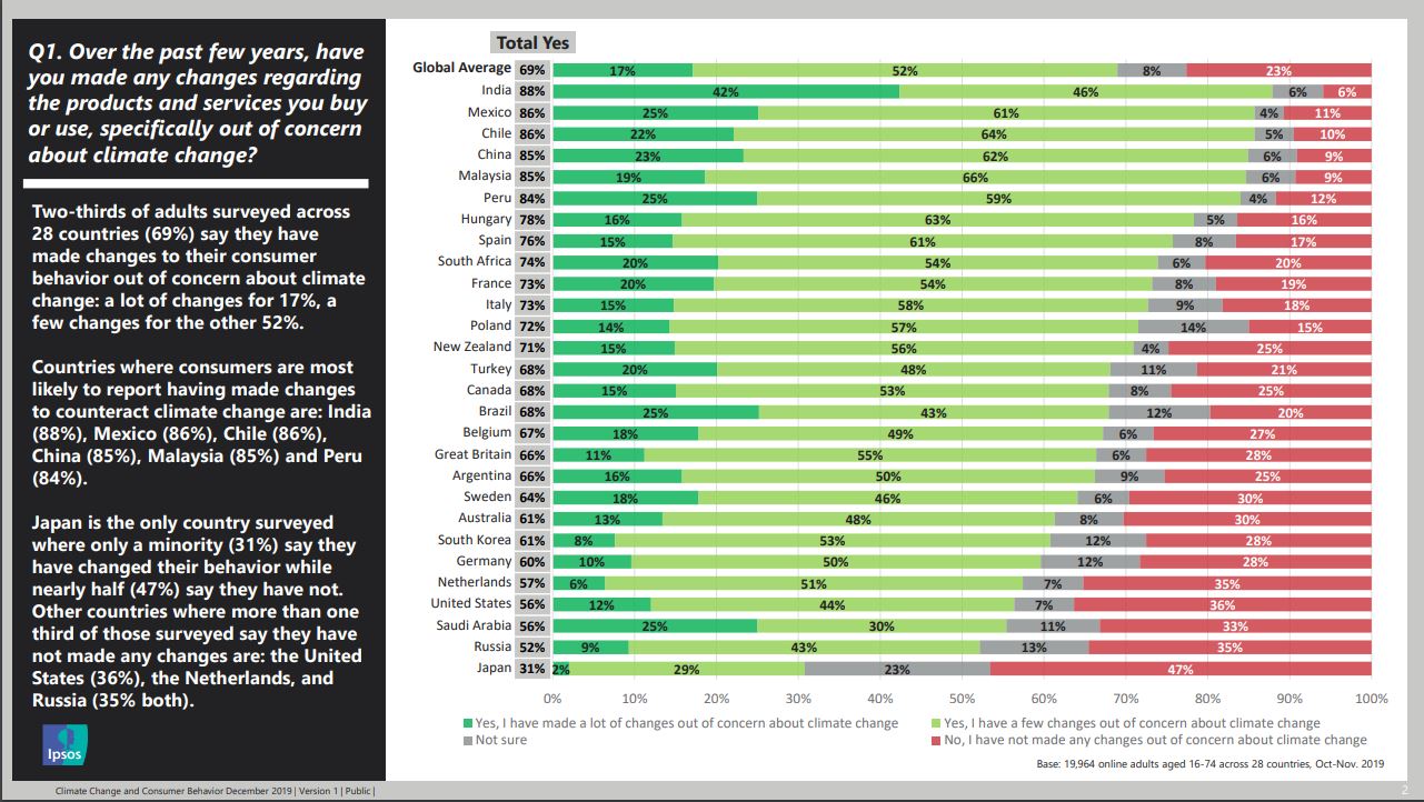 El estudio de Ipsos y el Foro Económico Mundial analiza como el cambio climático ha influido en el comportamiento de los consumidores en 28 países. En general, a nivel global, un 69 por ciento de los encuestados admite haber realizado modificaciones en sus hábitos de consumo por la preocupación ante los efectos del cambio climático. De estos, el 17 por ciento ha acometido «muchos» cambios y un 52 por ciento «solo algunos».
