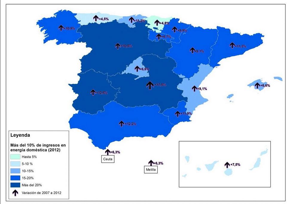 Según los datos recogidos en este último trabajo, correspondientes 2012 (las últimas disponible), el número de hogares que gastan más de un 10% de sus ingresos en el pago de las facturas de energía doméstica ha aumentado un 34%, y el número de personas que se declaran incapaces de mantener la vivienda a una temperatura adecuada un 50%, afectando esta situación al 9% de los hogares españoles; es decir, a unos cuatro millones de personas.