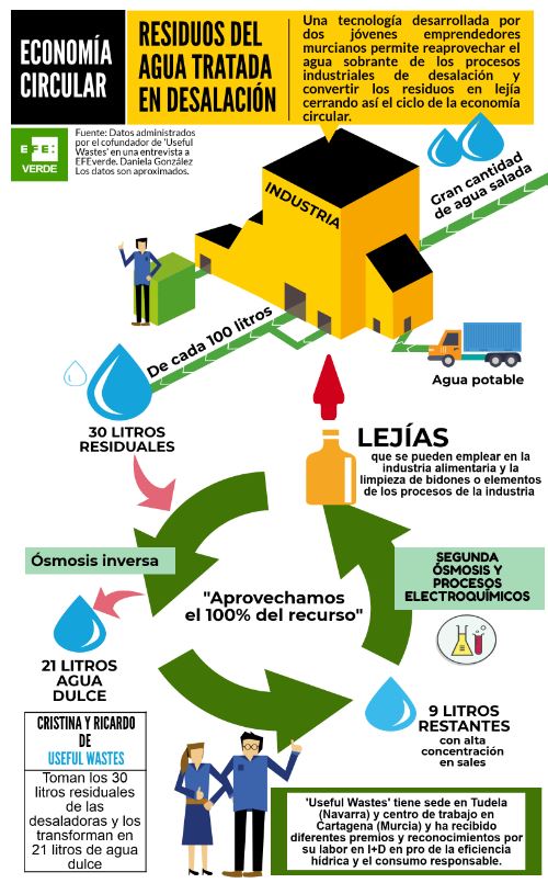 “Por cada 100 litros de agua, 70 son utilizados en la industria y los 30 sobrantes se tiran”, ha explicado a Efe el cofundador de ‘Useful Wastes‘ (‘Residuos útiles’, en español) Ricardo Martínez -de 26 años de edad-, quien afirma que gracias a esta nueva tecnología es posible reutilizar esos 30 litros “transformando 21 en agua más dulce y convirtiendo en residuo” y posteriormente en lejía los 9 litros restantes.